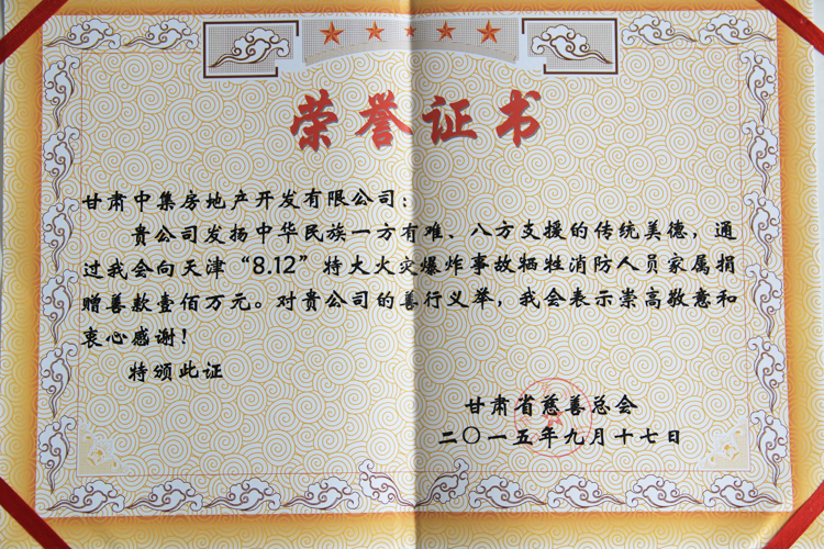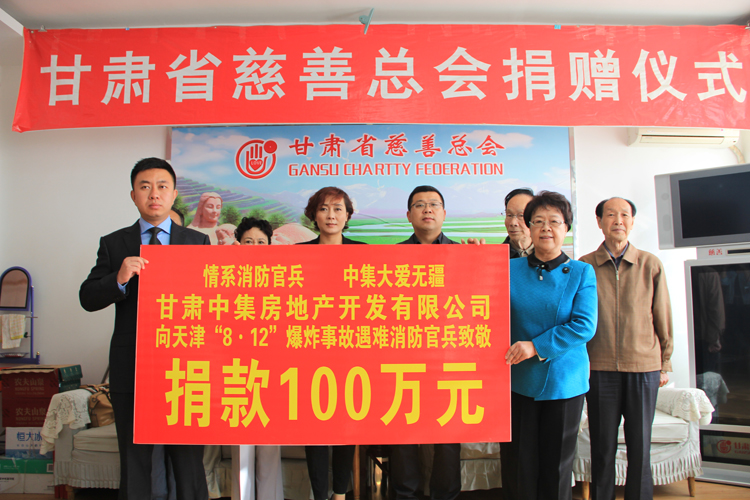 2015年8月12日23時(shí)30分,天津?yàn)I海新區(qū)國(guó)際物流中心發(fā)生重大爆炸火災(zāi)事故,造成重大人員傷亡。甘肅中集房地產(chǎn)開發(fā)有限公司總經(jīng)理周啟濤獲悉后,決定為在本次事故中犧牲的消防官兵及其家屬捐款100萬(wàn)元,用于幫助犧牲消防官兵家屬善后事宜的處理,以盡一份甘肅企業(yè)的慈善愛心。